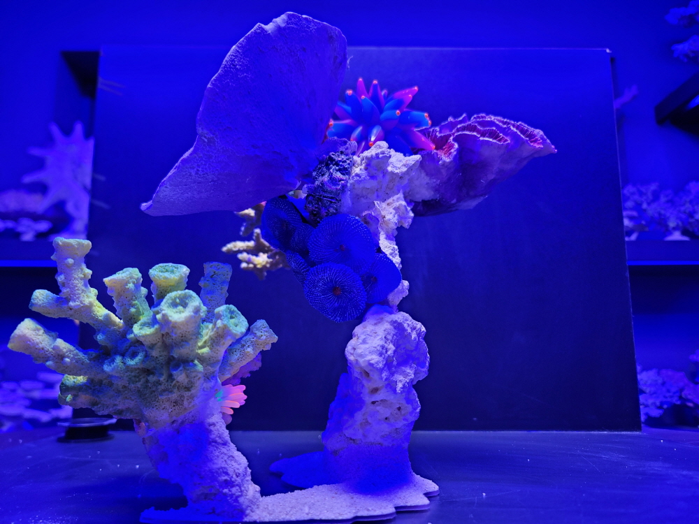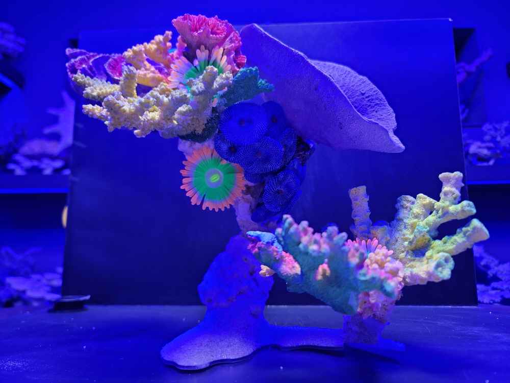 메인 줄기는 아라고 나이트락을 두껍지 않고 각을 틀어서 만들어 심플하게 디자인을 잡았고 크고 작은 각종 인조산호를 붙여 제작이 되었습니다.